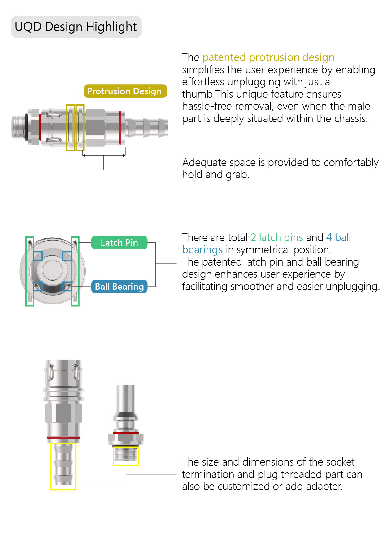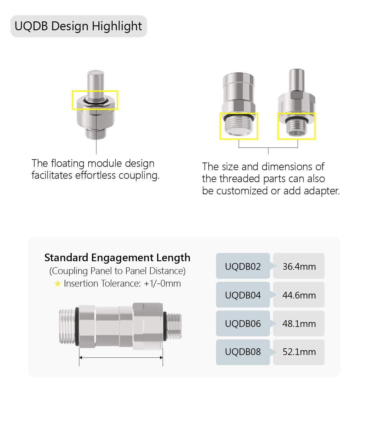 在更严格的测试条件下,UQD具有创新的设计,有助于降低流体损失,并提供比OCP(开放计算项目)标准更高的流动系数(Cv)。考虑到人体工程学,UQD系列设计了单手解锁结构,使插拔操作舒适、轻松。UQDB系列径向浮动间隙为±1mm,可满足客户对安装公差的要求。这增强了用户友好性和整体可用性,同时也促进了维护的简单性和效率。